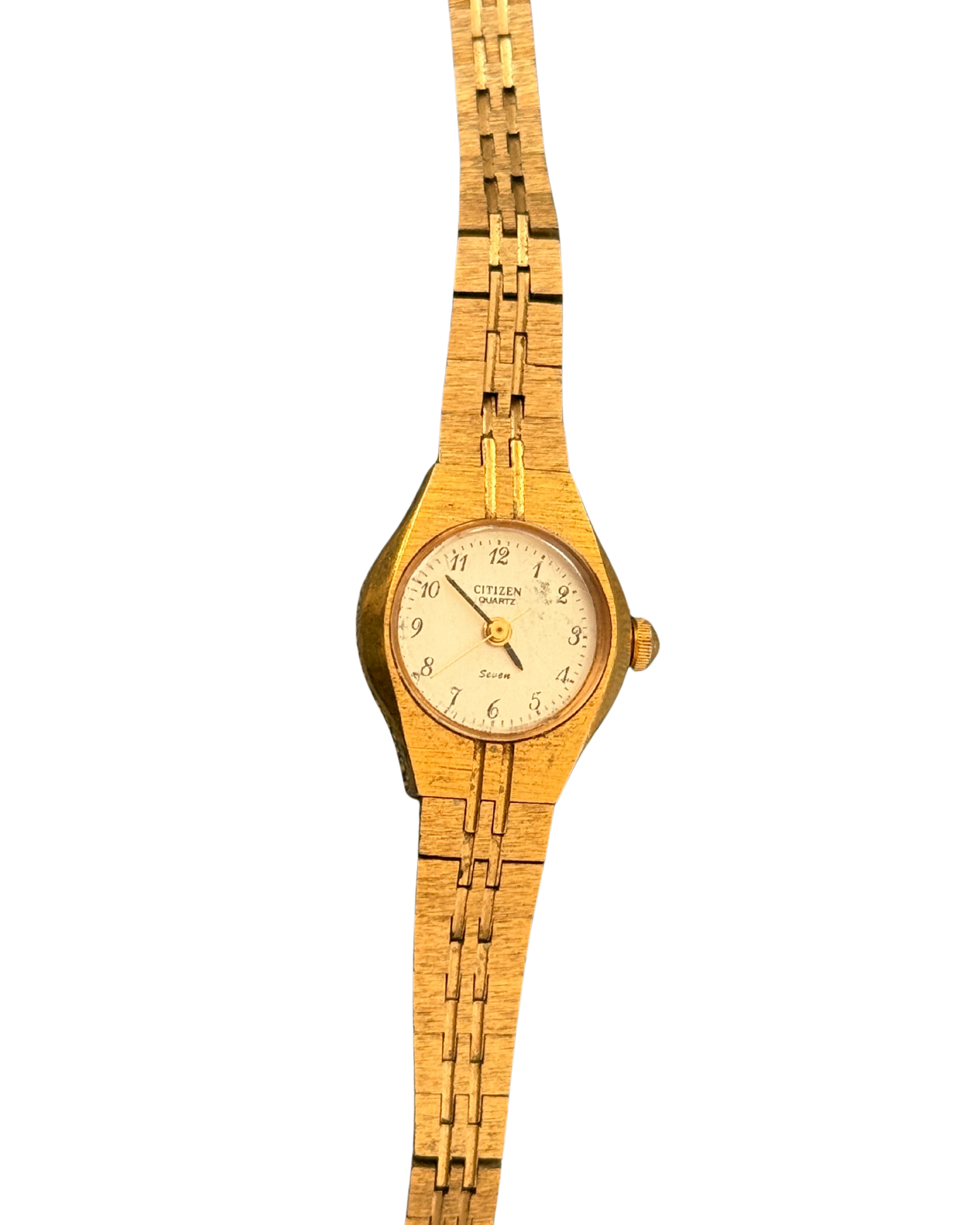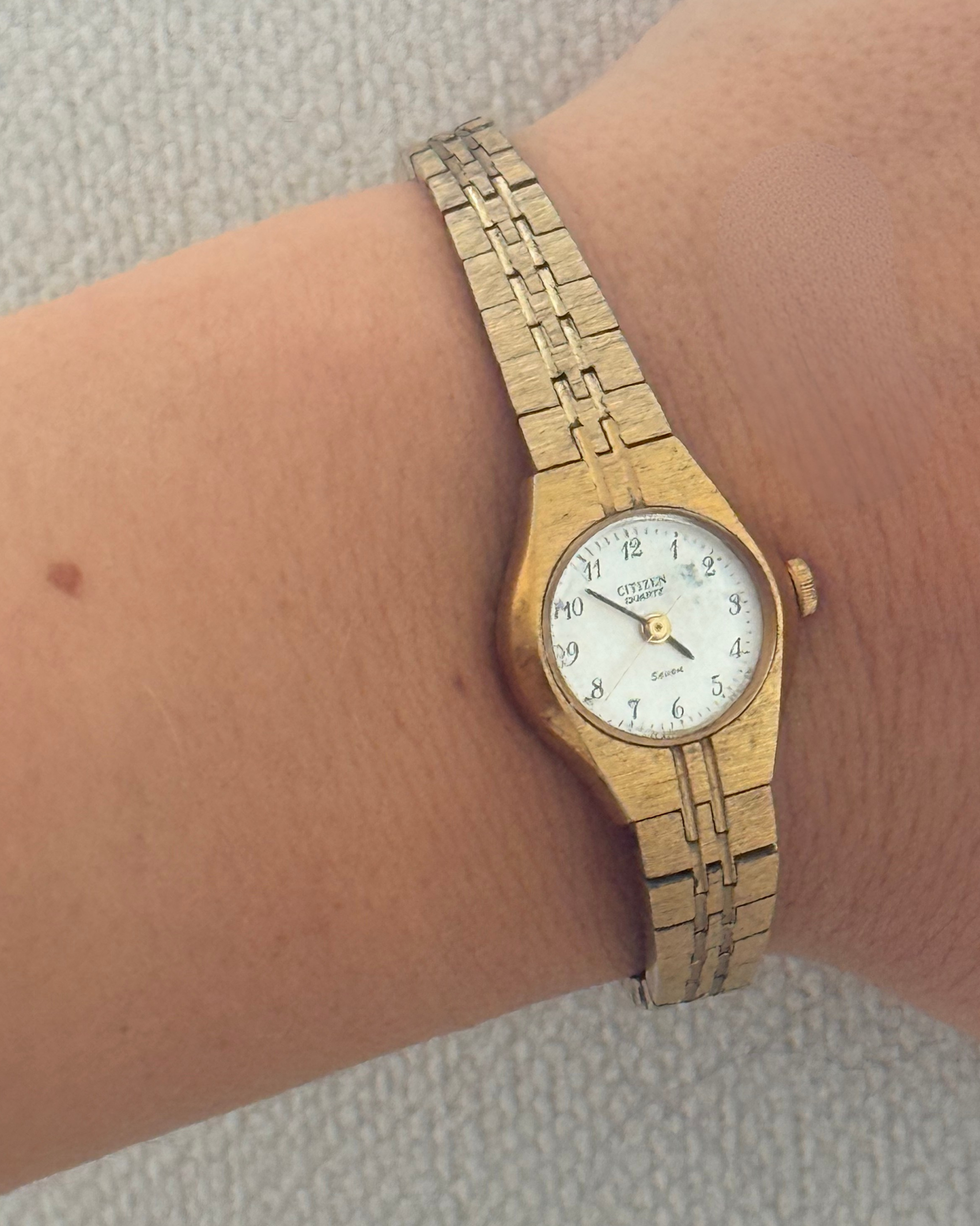 Slim, golden, and endlessly versatile. This vintage Citizen quartz watch brings a touch of understated luxury to the wrist—its petite face and gleaming bracelet designed for a lifetime of wear.